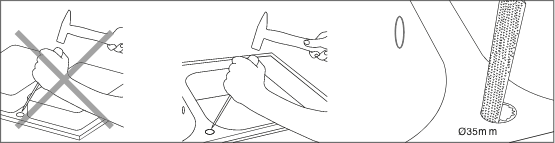 Der Spüle liegt kein Bohrer bei (bei den Modellen Formhaus und Typos der Cristalite-Spülenserie): Spüle in den vorbereiteten Ausschnitt einlegen, so dass der Spülenrand umlaufend auf der Arbeitsplatteaufliegt (ansonsten: Bruchgefahr!). Die möglichen Hahnlochbohrungen sind mit Klebepunkten gekennzeichnet. Das Loch wird mit einem kleinen Hammer, Meißel oder Schraubendreher von der Vorderseite her vorsichtig durchgeschlagen und aufgebrochen. Den Rand der Bohrung (Durchmesser 35 mm) mit einer Rundfeile glätten.